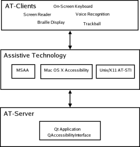 An application does not usually communicate directly with assistive tools but through an assistive technology, which is a bridge for exchange of information between the applications and the tools. Information about user interface elements, such as buttons and scroll bars, is exposed to the assistive technologies. Qt supports Microsoft Active Accessibility (MSAA) on Windows, Mac OS X Accessibility on Mac OS X, and AT-SPI on Unix/X11. On Unix/X11, support is preliminary. The individual technologies are abstracted from Qt, and there is only a single interface to consider. We will use MSAA throughout this document when we need to address technology related issues.
