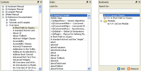 The tool windows can be docked into the main window, so you can drag them to the top, left, right or bottom of Qt Assistant's window, or you can drag them outside Qt Assistant to float them as independent windows.