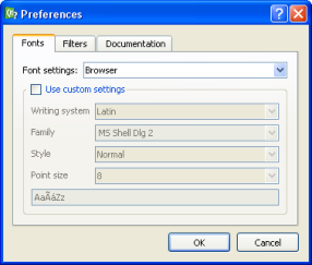 The 字体 page allows you to change the font family and font sizes of the browser window displaying the documentation or the application itself.