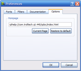 The 选项 page lets you specify the homepage Qt Assistant will display when you click the 首页 button in Qt Assistant 's main user interface. You can specify the homepage by typing it here or clicking on one of the buttons below the textbox. Current Page sets the currently displayed page as your home page while Restore to default will reset your home page to the default home page.