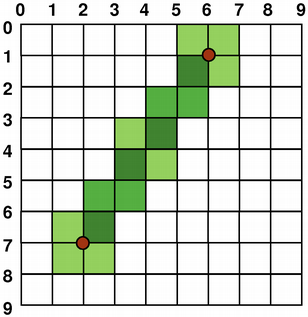 QPainter painter(this); painter.setRenderHint( QPainter::Antialiasing); painter.setPen(Qt::darkGreen); painter.drawLine(2, 7, 6, 1); |
