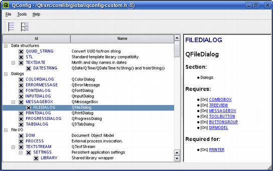 tool's interface displays all of Qt's functionality, and allows the user to both disable and enable features. The user can open and edit any custom configuration file located in the