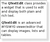 The QTextEdit 类提供用于编辑和显示纯文本和富文本两者的 Widget。 |