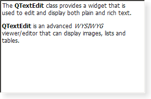 The QTextEdit 类提供用于编辑和显示纯文本和富文本两者的 Widget。 |