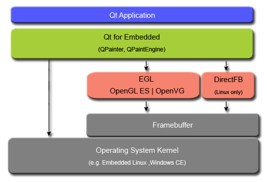 The QPaintEngine API provides paint engines for each window system and painting framework supported by Qt. In regards to Qt for Embedded, this also includes implementations for OpenGL ES versions 1.1 and 2.0, as well as OpenVG and DirectFB(Embedded Linux only).