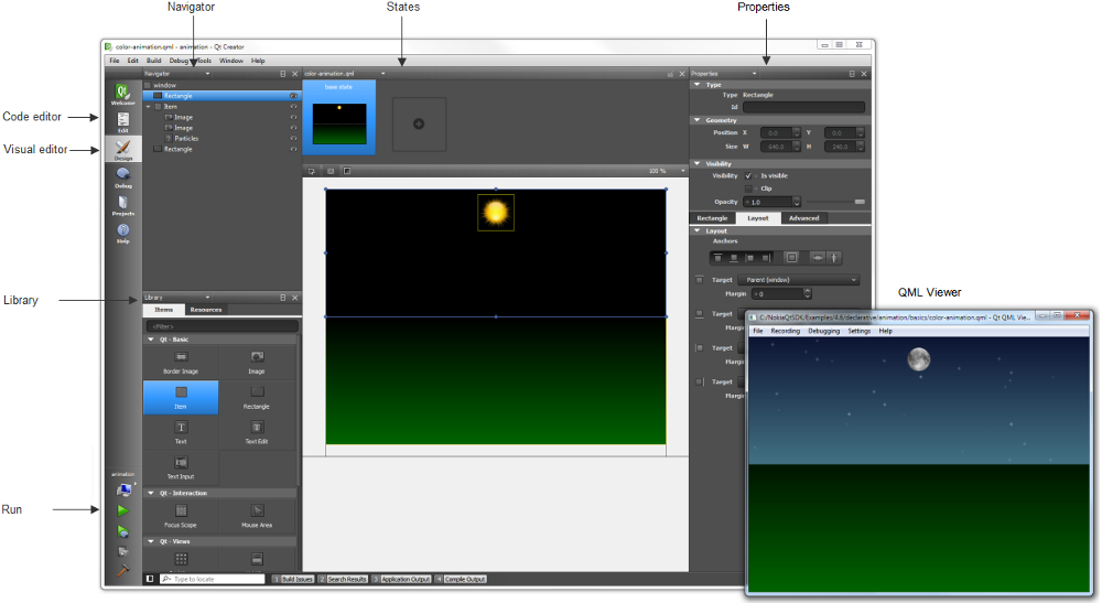 The main goal for Qt Creator is meeting the development needs of Qt Quick developers who are looking for simplicity, usability, productivity, extendibility and openness, while aiming to lower the barrier of entry for newcomers to Qt Quick and Qt. The key features of Qt Creator allow UI designers and developers to accomplish the following tasks: