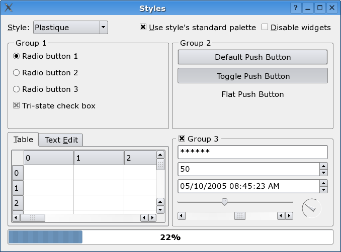 The Plastique style provides a default look and feel for widgets on X11 that closely resembles the Plastik style, introduced by Sandro Giessl in KDE 3.2.