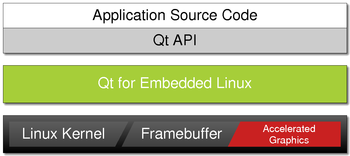 Qt for Embedded Linux is a C++ framework for GUI and application development for embedded devices. It runs on a variety of processors, usually with Embedded Linux. Qt for Embedded Linux provides the standard Qt API for embedded devices with a lightweight window system.