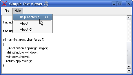 Note that we will only comment on the parts of the implementation that are relevant to the main issue, that is making Qt Assistant act as a customized help viewer for our Simple Text Viewer application.