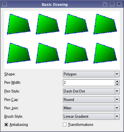 The example provides a render area, displaying the currently active shape, and lets the user manipulate the rendered shape and its appearance using the QPainter parameters: The user can change the active shape ( 形状 ), and modify the QPainter 's pen ( Pen Width , 钢笔样式 , Pen Cap , Pen Join ), brush ( Brush Style ) and render hints ( 抗锯齿 ). In addition the user can rotate a shape ( 变换 ); behind the scenes we use QPainter 's ability to manipulate the coordinate system to perform the rotation.