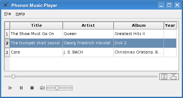 The user can use a file dialog to add music files to a table, which displays meta information about the music - such as the title, album, and artist. Each row contains information about a single music file; to play it, the user selects that row and presses the play button. Also, when a row is selected, the files in the table are queued for playback.
