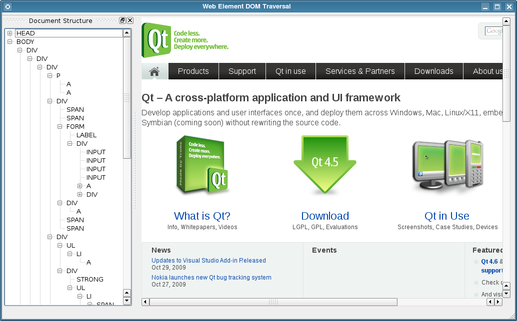 When the application's event loop is run, the Qt home page will load, and the tree widget will be updated to show the document structure. Navigating to another page will cause the tree widget to be updated to show the document structure of the new page.