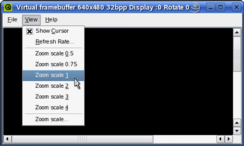 The File menu allows the user to configure the virtual framebuffer display ( File|Configure... ), save a snapshot of the framebuffer contents ( File|Save Image... ) and record the movements in the framebuffer ( File|Animation... ).